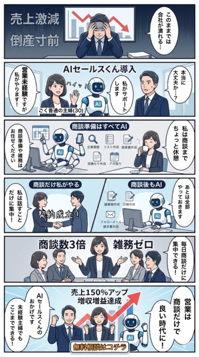【マンガでわかる】商談数3倍・売上150%アップ。未経験者でも成果を出せる、AIセールスくんとは 2025 12/16 AIセールス支援 2025年12月15日2025年12月16日 AIセールスくんをわかりやすくマンガでまとめてみました。 お問い合わせ Webから業務システム、AI・IoTまで。まずは以下より無料相談ください。 お問い合わせ AIセールス支援 よかったらシェアしてね! URLをコピーしました! URLをコピーしました!