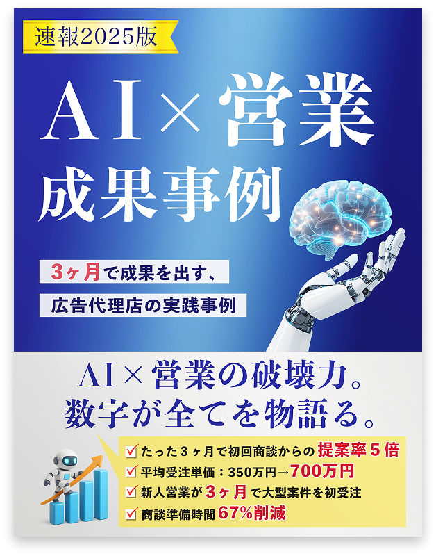 新規開拓に力を入れているのに伸び悩んでいる、もっと成果を出したい。 そんな現場を変えるために、営業プロセスに沿ってAIを組み合わせ、 提案精度と成約率を高めた広告代理店・マーケ企業の実例を公開。